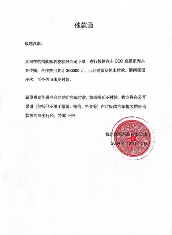同时该传媒公司还称:“为了避免不必要的法律纠纷,请贵司于2024年12月31日之前完成付款。若贵司未能在上述期限内支付款项,我方将在媒体渠道公开声讨极越拖欠供应商款项行为,同时通过法律途径追讨欠款。”