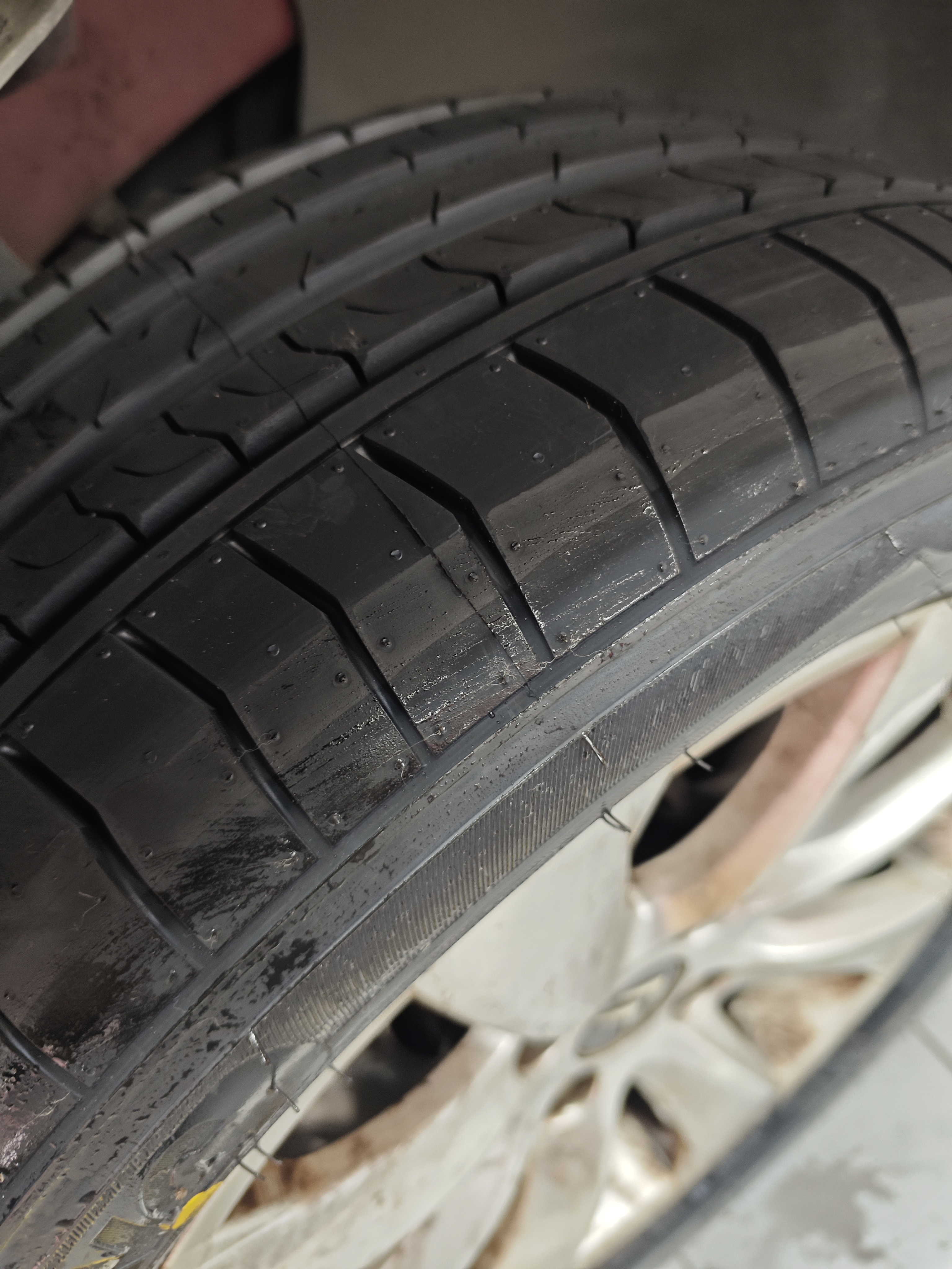 轮胎拆下来那一刻,俺的额头渗出了汗。轮胎正面中间的沟槽中,肉眼可见条条裂缝。