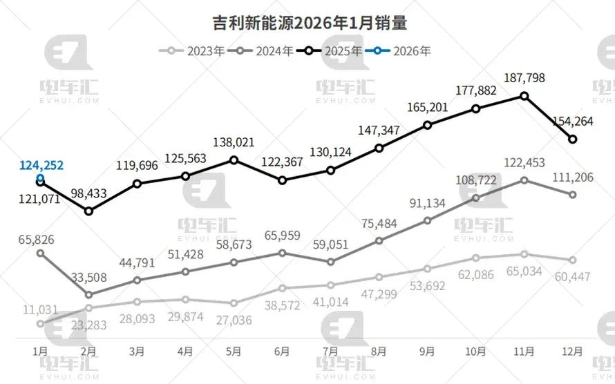 吉利乘用车1月销量为124,252辆,环比下降19.5%,同比增长2.6%。其中极氪品牌实现交付23,852台,同比增长99.7%。整体维持高位运行,稳居第二名,展现出较强的市场韧性。