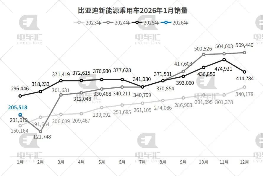 比亚迪乘用车1月销量为205,518辆,环比下降50.5%,同比下降30.7%。受去年同期高基数及春节前订单集中交付影响,本月销量出现明显回调,但仍以绝对优势位居行业第一。