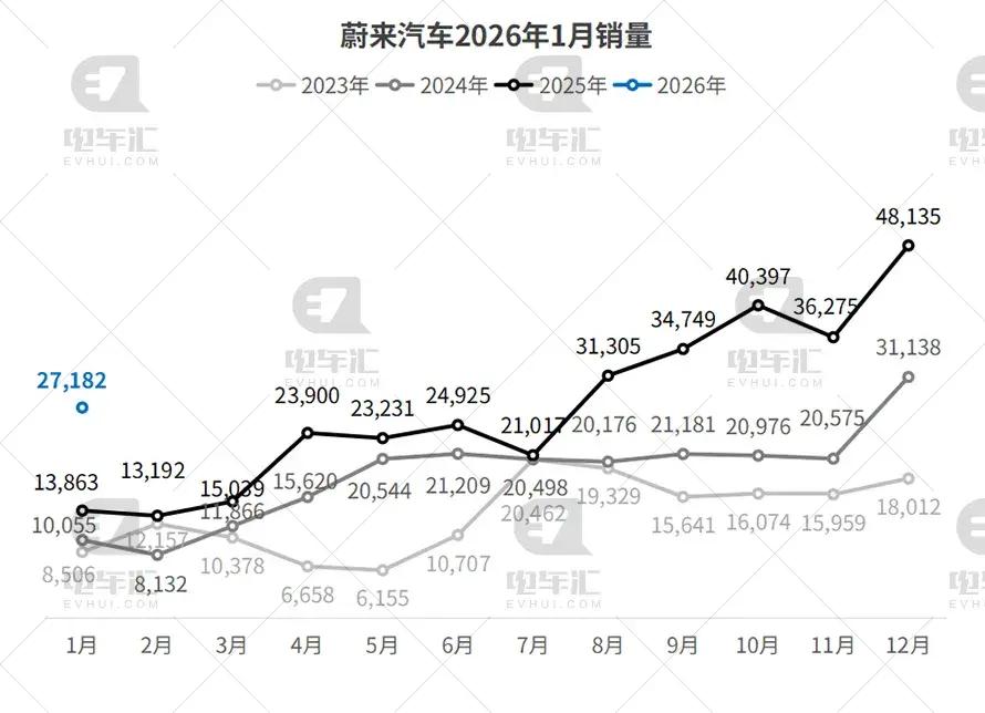 蔚来汽车1月交付27,182辆,环比下降43.5%,同比增长96.1%。全新ES8单月交付超1.7万辆,成为核心增长引擎,乐道L60产能稳步爬坡,换电网络优势持续兑现。