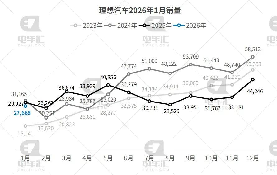 理想汽车1月销量为27,668辆,环比下降37.5%,同比下降7.5%。L系列改款过渡期叠加纯电i6尚未全面放量,导致销量小幅下滑,但基本盘稳定。