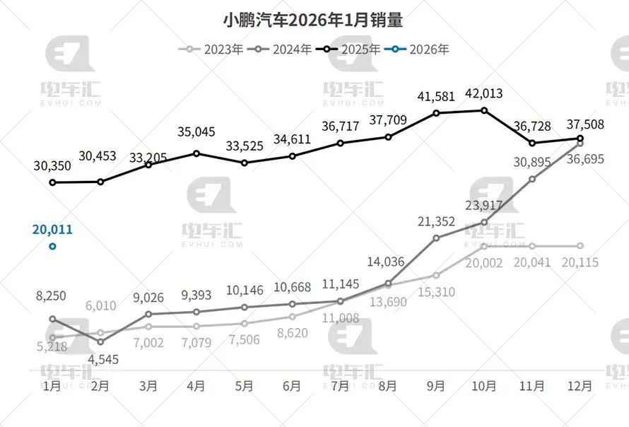 小鹏汽车1月交付20,011辆,环比下降46.6%,同比下降34.1%。MONA M03虽有贡献,但整体表现不及预期,面临产品迭代与竞争压力双重挑战。