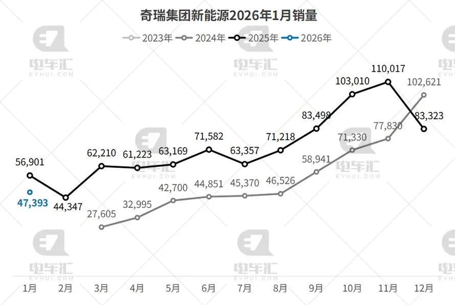 奇瑞新能源1月销量为47,393辆,环比下降43.1%,同比下降16.7%。受产品周期切换及市场竞争加剧影响,销量同比下滑,但仍在自主阵营中保持较强竞争力。