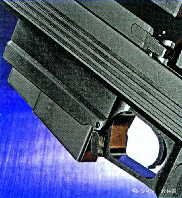 铝合金枪托特写,可以看到可调节的贴腮板。枪托下部设有一段导轨,可安装背带环(如图),也可以更换为安装单脚架 弹匣座 AR-30未设弹匣座,只是在机匣下方开有弹匣插孔,因无适当的导引,故安装弹匣时不够方便。AR-30A1则设置了弹匣座,便于射手快速插入弹匣。弹匣卡笋设在扳机护圈前部,且双侧设置,能够满足左右手不同射手的习惯。