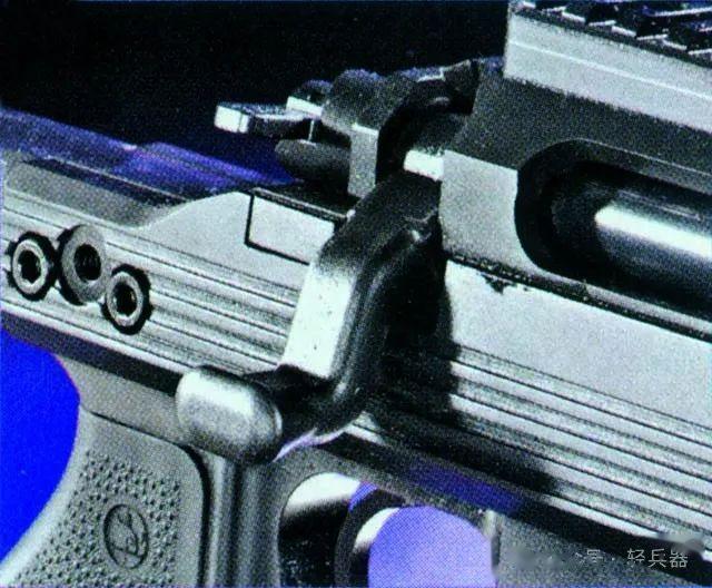 保险特写。图中保险扳向左侧即保险位置 可调节枪托 原型枪AR-30的枪托为骨架式,枪托上面只是简单地设置有贴腮板和抵肩板,其贴腮板高度不可调,抵肩板未设缓冲垫。而AR-30A1对枪托进行了大量改进。其枪托外形已完全改变,贴腮板高度可调,贴腮板上设有一块橡胶垫,射手在各种天气条件下都能很舒适地贴腮。抵肩部分设有一个橡胶缓冲垫,能缓冲一定的后坐力。枪托下部设有一段导轨,可安装背带环,也可以更换为安装单脚架,用于支撑枪身。