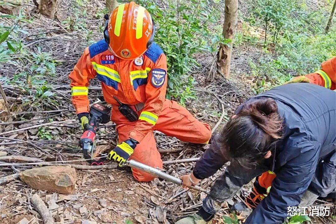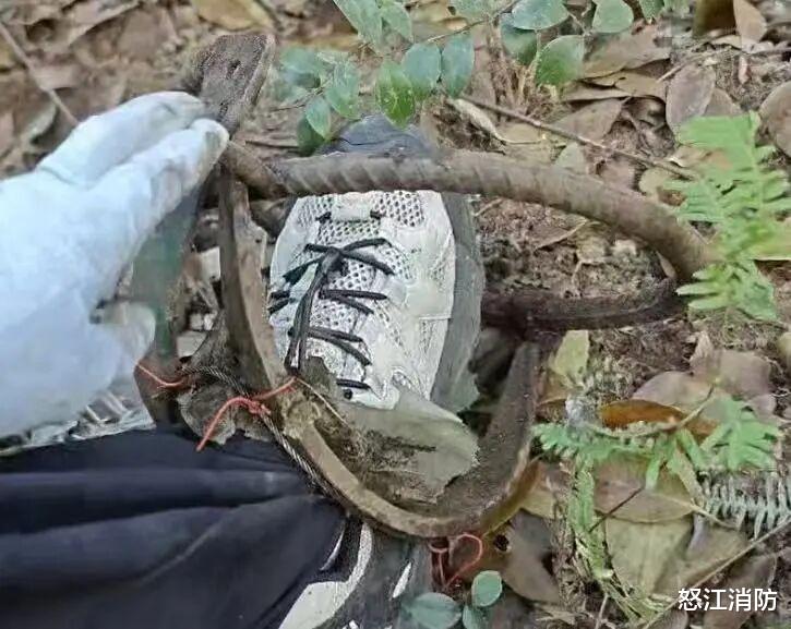为男子左脚鞋侧被野猪夹紧紧夹住