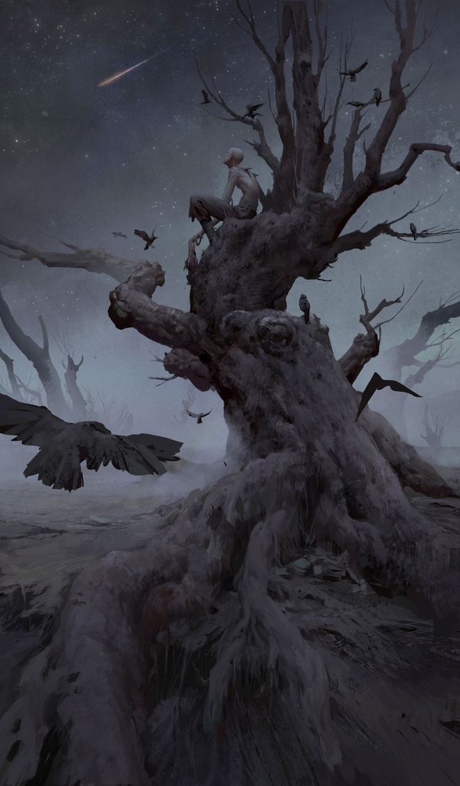 细节塑造完成之后,再对画面进行最后的调整渲染,检查画上去的细节是否破坏了原本定好的大效果。为了增加画面氛围和景深层次,这里加了远近不一的一群乌鸦。这类空间中的悬浮体能够很容易增加画面层次。我们还可以通过色阶和曲线等调色工具,来调节画面各处的对比度,让远景更低对比更柔和,让画面中心更高对比更突出。在最后把画面的比例做了一下拉伸,让前景占比更多,增强画面的纵深感与张力。