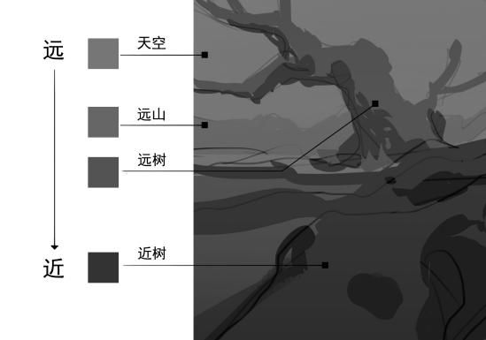 受大气透视影响,景深会形成前暗后亮的样貌。即天空最亮,由后往前每一层颜色依次变暗。画户外阴天环境时,画面景深就会遵循这样的规律。在这个基础上可以加入二分光影确立初步体积。