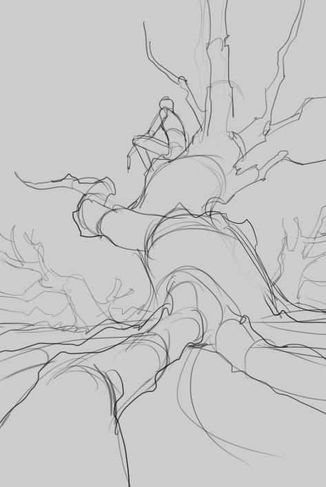 这里有几个注意点:一是树和角色可以都先用圆柱造型概括。因为草稿中圆柱的弧度纬线可以很大程度帮助我们建立对体积的纵深的想象,让画面不至于太过平面。
