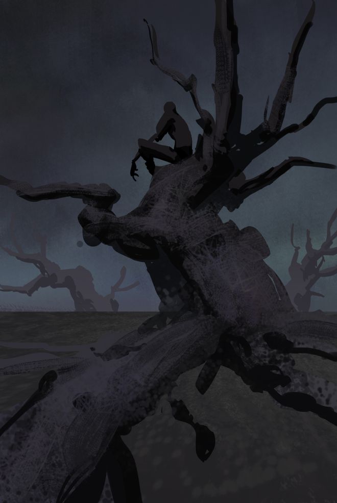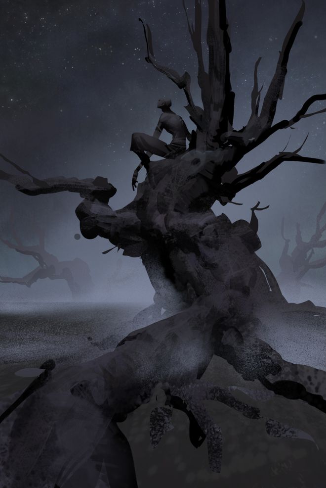 处于画面最中心位置的树是重点刻画对象之一。一方面需要有更多的细节体积起伏,更强的笔刷纹理,另一方面也要注意剪影的完成度。如果只是单纯的内构复杂,但是剪影没有起伏,内构就会容易显得脱节。所以这里在树的轮廓上加多了很多中小细节。加了很多细小的树枝起伏。太细的树枝在内构上反而不需要太多处理,甚至是平涂都没有关系,只要剪影足够细致,就可以起到增加细节的作用。
