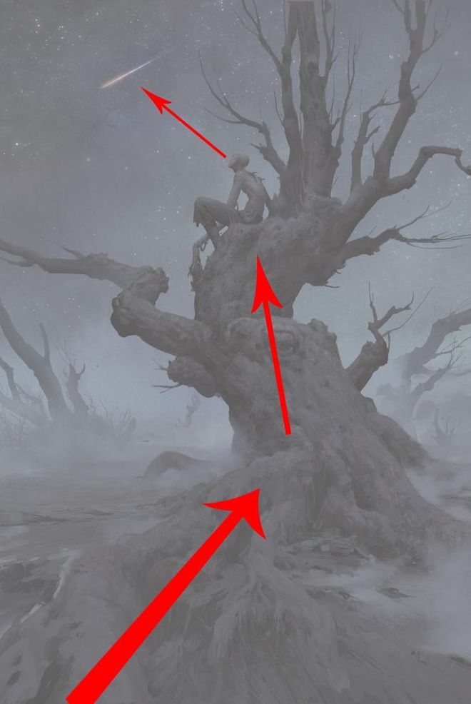 角色往画面左上方眺望,使得整张图在视觉引导上联系起来:前景树根引导观众看到中间的树,树往上生长把视觉引导到角色,观众再顺着角色的目光方向看到划过天空的流星。