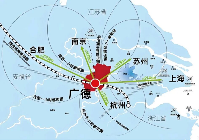 广德的“先天优势”,是老天爷赏的地理位置——它处在长三角地理几何中心,是安徽唯一同时毗邻江苏、浙江两省的县级市,距上海、杭州、南京、合肥等核心城市均在2小时交通圈内,高铁到湖州仅需9分钟,比很多城市的跨区通勤还快。