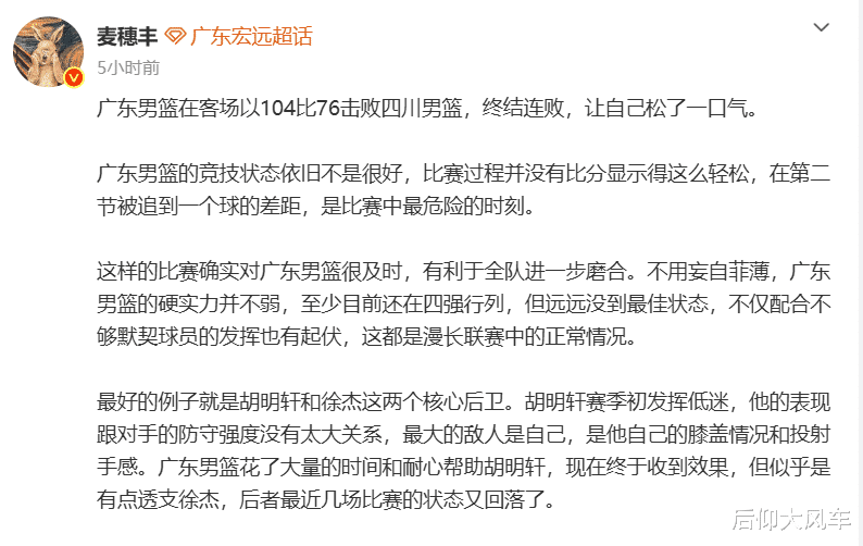 不妨先来看看媒体人麦穗丰的个人见解,麦老师依旧认为广东队的竞技状态不是很好,比赛过程并没有比分显示得这么轻松,广东男篮的硬实力并不弱,至少目前还在四强行列,但远远没到最佳状态,不仅配合不够默契球员的发挥也有起伏,这都是漫长联赛中的正常情况。