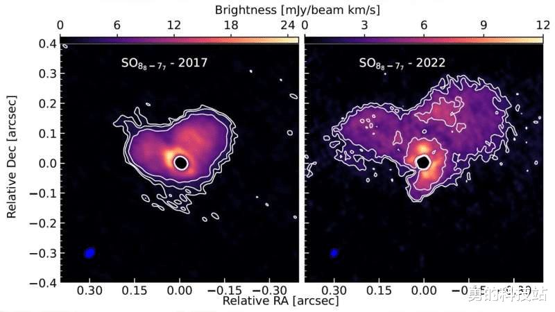 Mira A——已被记录百年的红巨星Mira A 是一颗众所周知的星体,最早的记录可追溯到 1596 年。它作为寿命最后阶段的红巨星,向周围环境喷射尘埃和气体。Khouri 及其团队在 2015‑2023 年间获取的观测数据中,发现了两大云团正从 Mira A 向外扩散。