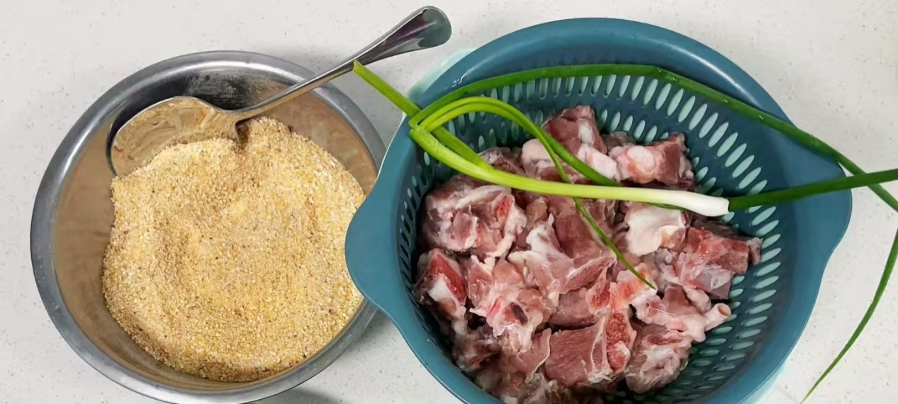 主角先排队:肋排500克、蒸肉米粉120克(超市杂粮柜就有,3块钱一包)、生姜1块、大蒜5瓣、郫县豆瓣1大勺、腐乳汁1小勺、生抽1勺、老抽半勺、料酒1勺、白糖半勺、白胡椒一小撮,再抓一把荷叶或干粽叶(没有就用盘子,但荷叶自带清香buff,谁用谁知道)。排骨让摊主剁成长条,回家用清水泡20分钟,把血水“泡”走,蒸出来才不暗不腥。泡完沥干,用厨房纸摁干表面,腌料才挂得牢。