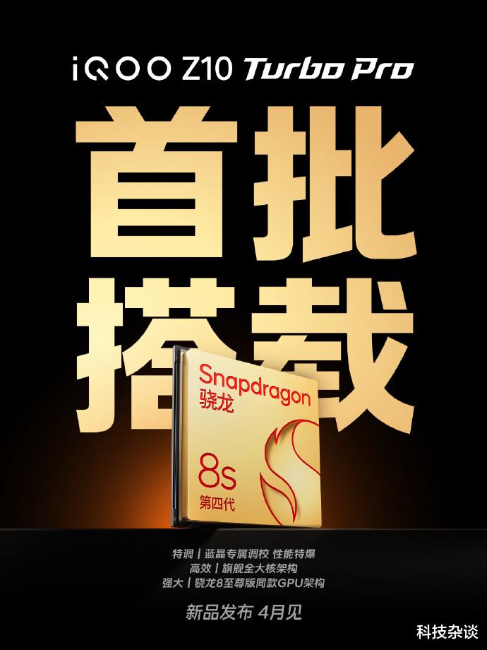 官方称iQOO Z10 Turbo Pro将首批搭载第四代骁龙8s,并且拥有蓝晶科技专属调校。官方还表示骁龙调校看iQOO,特爆Pro、性能特爆,十中Pro,4月见。从官方的的描述中可以明确看到iQOO Z10 Turb Pro是一款以性能为主打的中端机型。信息显示高通骁龙8s Gen4是基于台积电4nm制程打造的,CPU性能同比上一代提升31%,GPU性能同比上一代提升49%,GPU能效提升39%。与此同时还带来终端假侧生成式AI,AI性能提升44%等等。当然这些都需要商用落地之后才能感受到,目前仅是一个数字化的直观印象。
