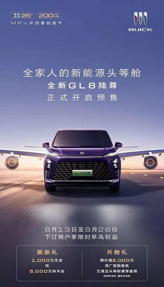 日前,车质网从上汽通用别克官方获悉,全新别克GL8陆尊PHEV正式开启预售,共推出3款配置车型,全系均为艾维亚版本。8月13日至8月26日下订用户享限时早鸟权益,包括1000元定金抵5000元购车金、赠价值2000元原厂智能香氛和艾维亚头等舱奢享套装。