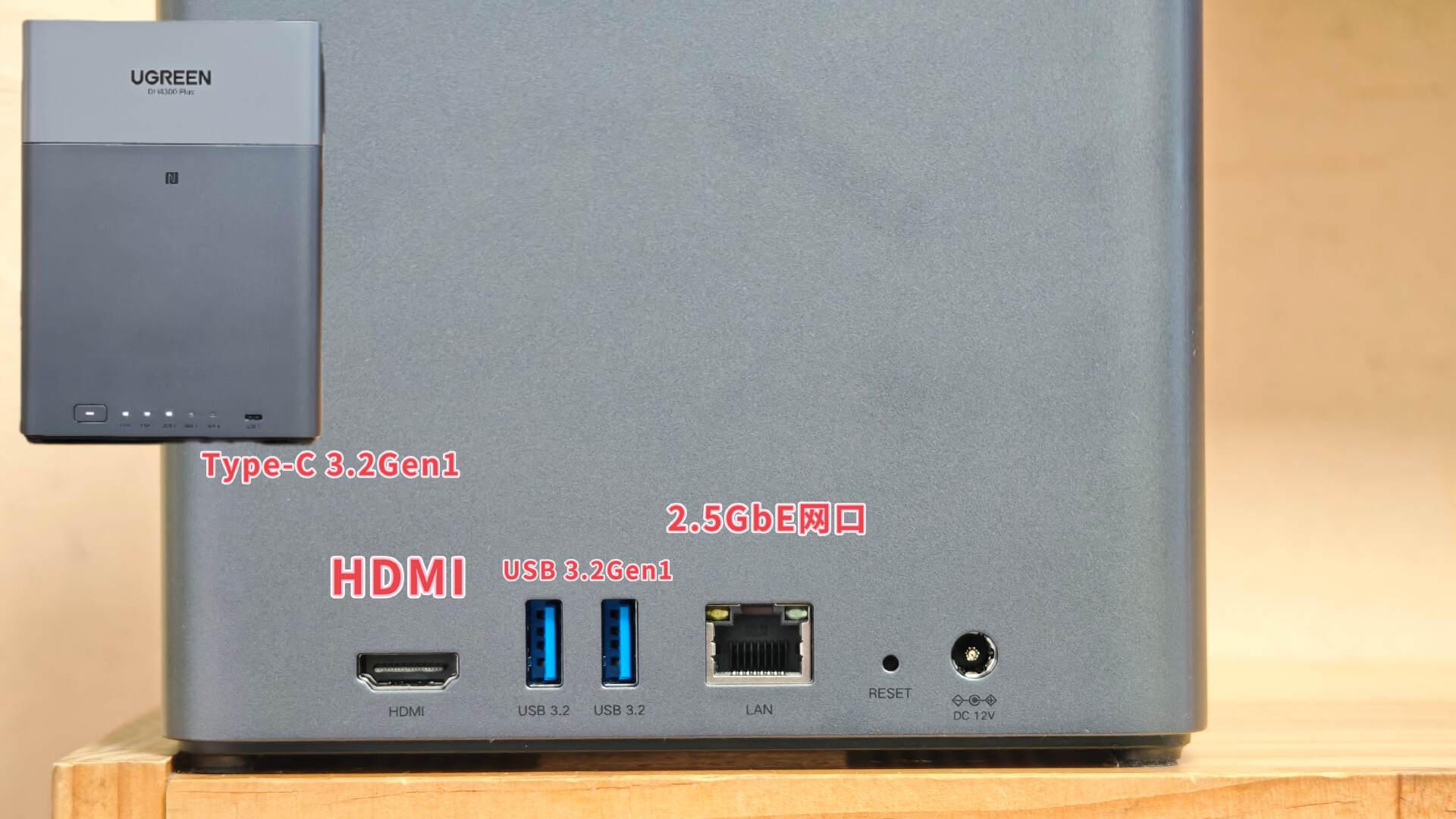 绿联DH4300 Plus的接口配置也很丰富:2.5GbE网口在千兆局域网中可以实现280M/S数据传递速率,直接开启“跑高速”模式;一个HDMI接口,两个USB 3.2Gen1接口,前面还有一个USB Type-C 3.2Gen1接口,日常折腾完全够用。