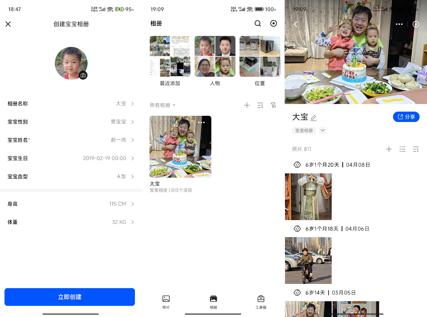 在成千上万张图片中,可能老人只对自己的孙子感兴趣,怎样快速为孩子建一个专属相册呢?其实所有的图片一经上传到私有云上,智能相册就对它们进行了整理归类。这个时候我们只需要建立一个宝宝相册,提供孩子的一定的年龄信息,那么相册就可以实现自动按照孩子年龄的顺序进行排列,非常简便。