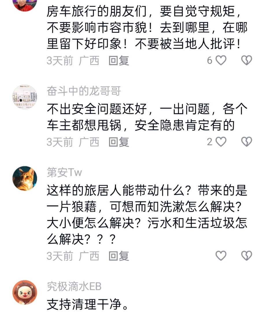 有网友说,房车营地应该按停车场一样管理收费,一小时收费10元钱,禁止车外做饭,禁止拉绳晒衣服。禁止狗🐕屎到处都是。这样保证环境不被破坏。