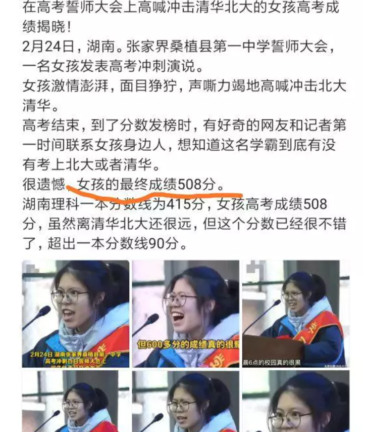 有网友爆料称,女孩的高考成绩是508分,这个成绩在湖南省已经算非常不错的了,而且超出了一本线90分,但就是好像跟她梦想的清华北大还有一定差距。
