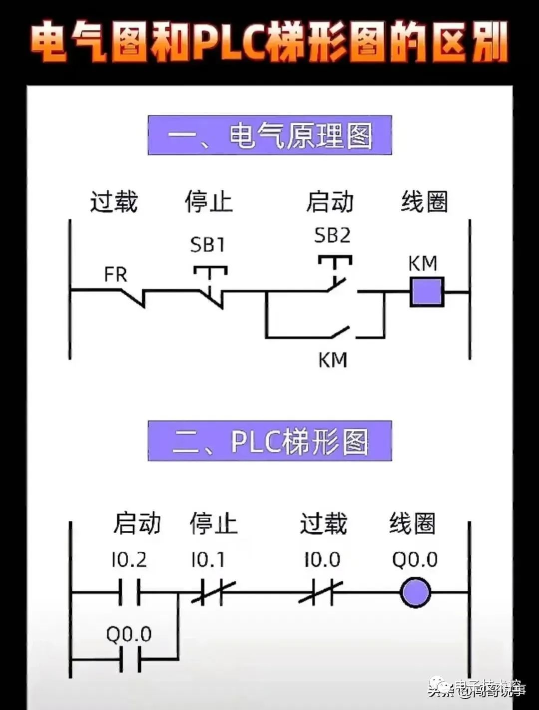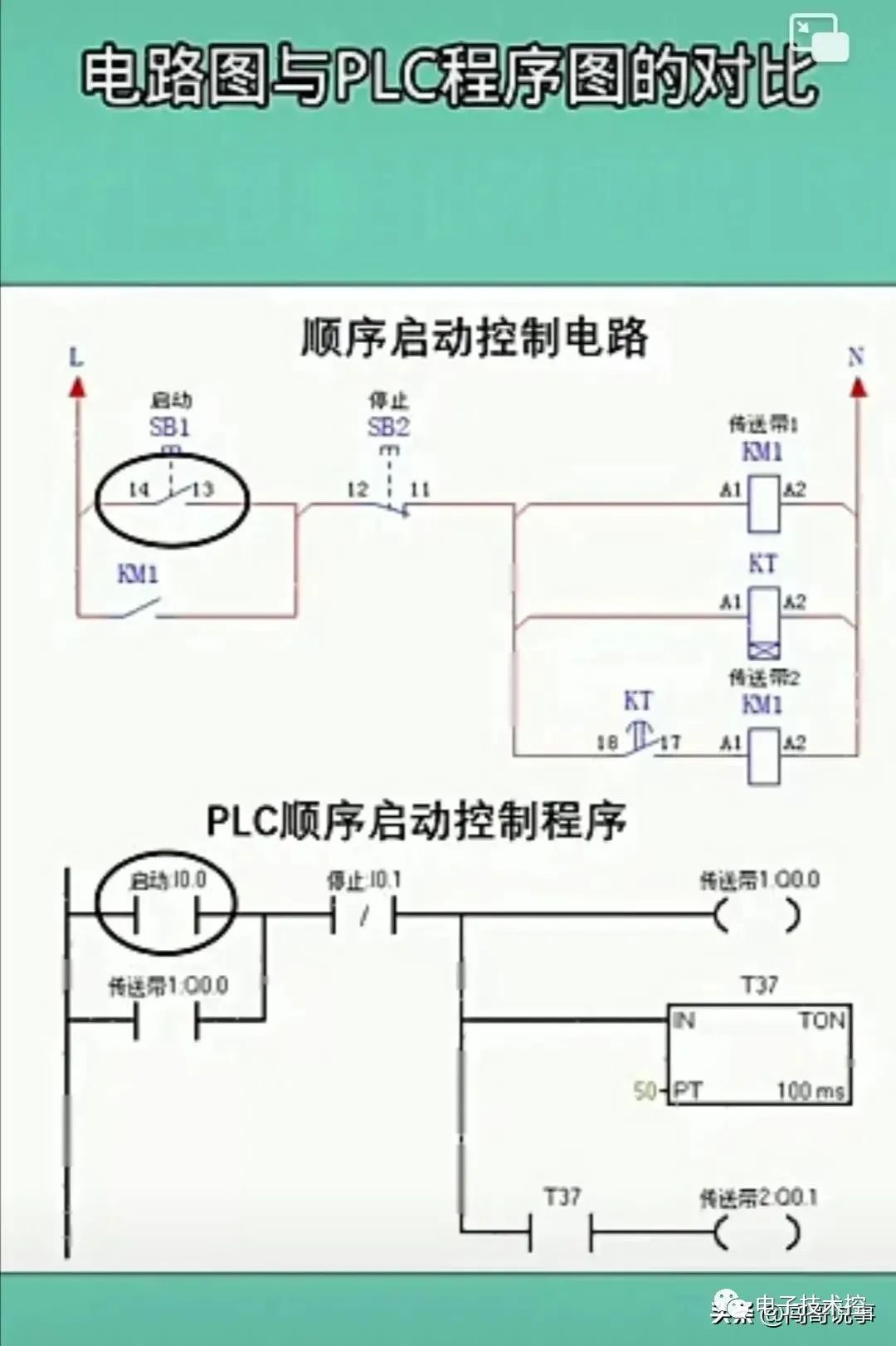 路图与PLC程序的对比:顺序启动控制电路和PLC顺序启动控制程序