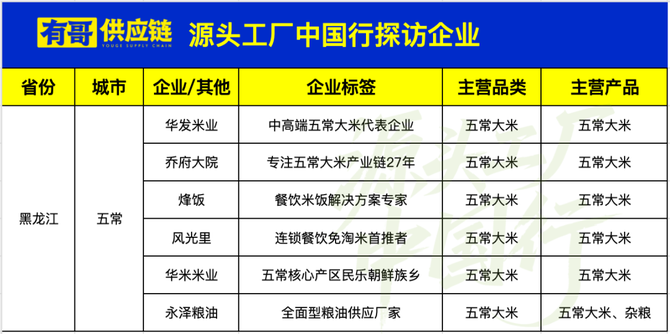 乔府大院、风光里、烽饭、华发米业、华米米业、永泽粮油等企业,作为当地的实力工厂,各有其核心优势,风光里作为较早为餐饮企业提供定制化服务的源头工厂,其首推的免淘米工艺,以及创新的规格设计,让后厨的效率大大提升;烽饭重设备上投入,碎米率在2%以下;华发米业是中高端大米代表,原粮仓储容量达到10万吨……