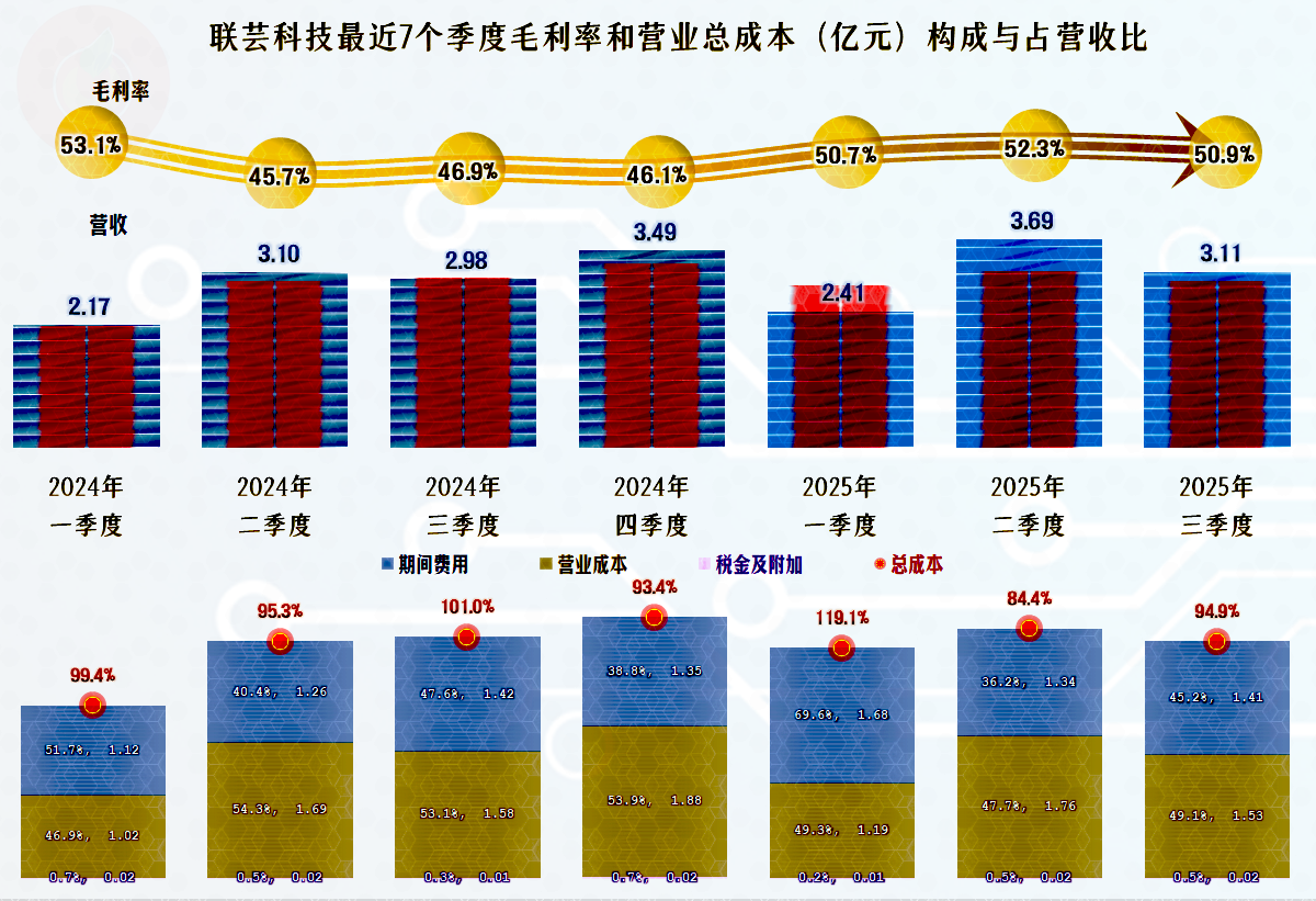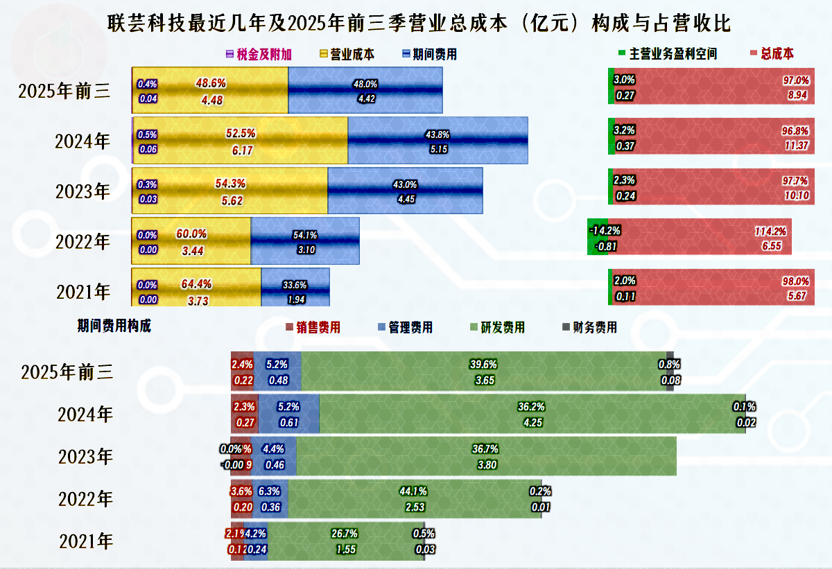 期间费用持续快速增长,就算扣除2022年的营收“意外”下跌,2024年和2025年前三季度营收增长的速度也不及期间费用;2023年较2022年的期间费用占营收比下降,但较2021年仍是增长的状态。
