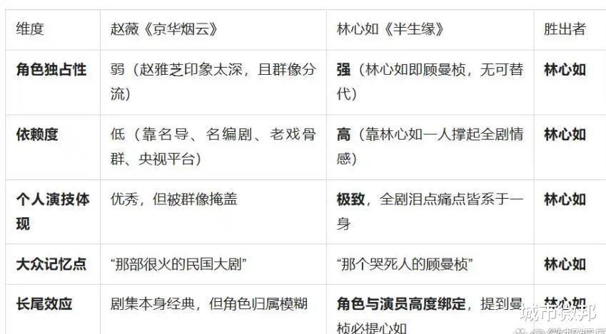 这两点如果成立,那么《半生缘》作为林心如个人代表作的地位,确实要比《京华烟云》作为赵薇代表作的地位更加纯粹和稳固。
