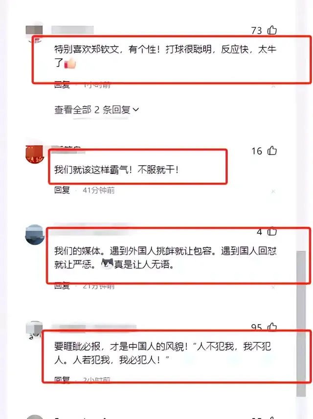 与此同时,郑钦文在赛场上面对不文明观众的勇敢回怼,展现了她果敢和坚决的一面,给所有人留下了深刻印象。她的行为引发了广泛的讨论,有人觉得她的做法过于直接,而有人则对她的勇敢表示赞赏和支持。