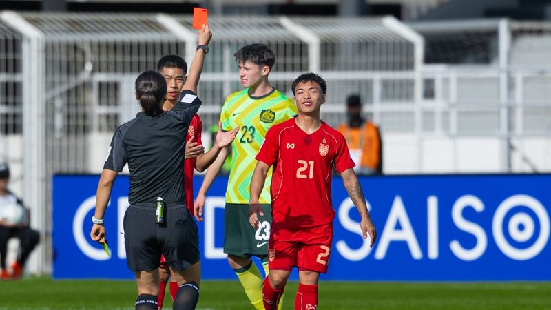 在本组的另外一场比赛里,澳大利亚队迎来了小组实力最弱的泰国队。不过令大家没有想到的是,本场率先进球的,却是泰国队。比赛开始仅8分钟,泰国队利用一次角球机会发动进攻,西达禁区线上的抽射打在澳大利亚防守球员腿上后反弹飞入网窝,泰国队幸运地取得了1-0的领先。但是泰国球迷的兴奋只持续了短短3分钟,第11分钟,泰国队的边后卫延森飞铲对手被直红罚下,而这张红牌,也彻底改变了比赛的走势。