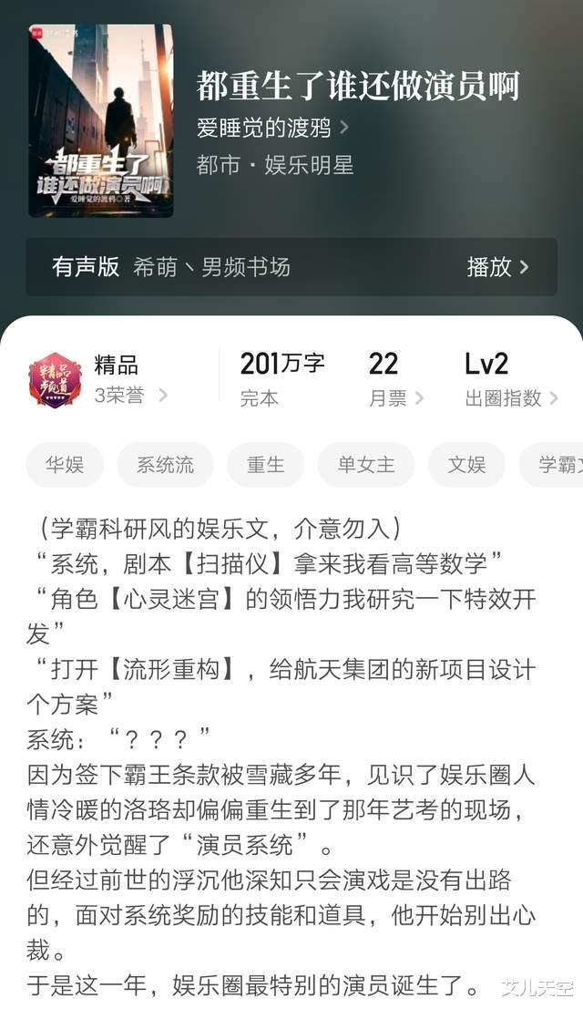 随后又开启了一个演员培养系统,由此开始了重活一世弥补各种遗憾的娱乐之路。小说写了不到一年,断更了快一个月给出了大结局,成绩看着在四五千均之间。