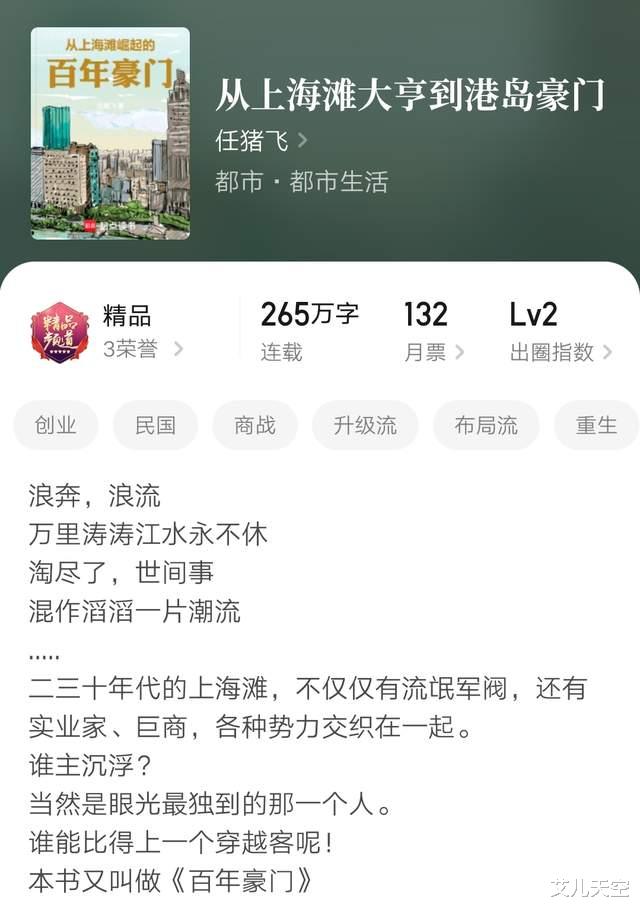 任猪飞作品,写过《香江新豪门》《港岛家族的诞生》等小说,也都有精品成绩。这本也还是这类题材,主角穿越1927年的上海,从人力车夫开始了这个故事,四千均。