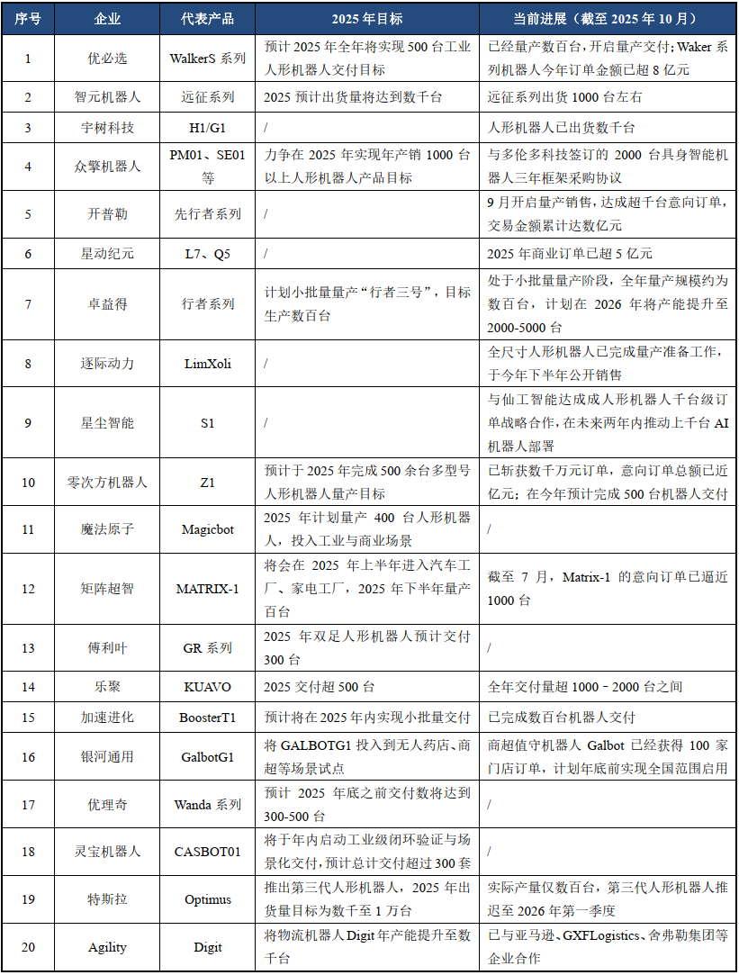 整体来看,国内企业在量产交付与商业化进度上领先。特斯拉Optimus实际产量仅数百台,第三代产品推迟至2026年发布;国内头部人形机器人企业已进入量产交付与场景落地的关键阶段,头部企业量产能力突出:优必选、智元、宇树科技等已实现数百至数千台交付,订单金额超数亿元;乐聚、加速进化、星动纪元等企业也完成数百台至千台级交付,商业订单规模可观。图表9 人形机器人行业重点企业对比
