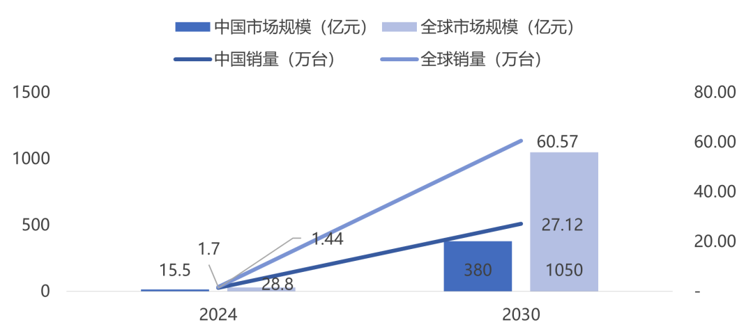 市场层面的需求为行业发展提供了强劲动力,从工业制造向医疗康养、商业服务、特种作业等多元领域渗透,进一步打开了市场增长空间。根据《宇树机器人招说明书》披露的信息,2024年中国人形机器人市场规模约为15.5亿元,约占到全球的53.8%。预计到2030年,国内人形机器人市场规模有望达到380亿,销量有望达到27.12万台,年复合增长率CAGR约70.4%。图表7 中国人形机器人市场规模