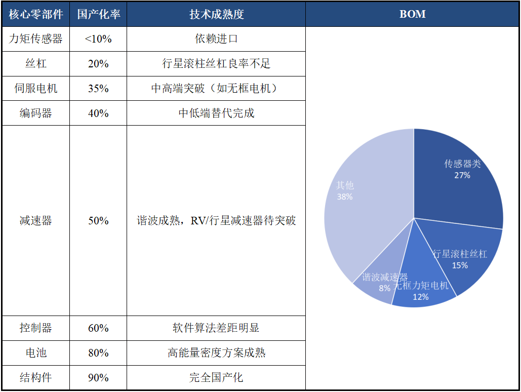 人形机器人整机成本的70%集中在上游核心零部件。投资破局点在于寻找能解决“卡脖子”环节(如高精传感器、行星滚柱丝杠)或在关键部件(如无框力矩电机、谐波减速器)上实现国产替代降本的企业。