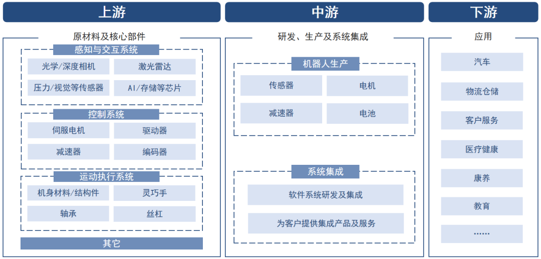 人形机器人产业链由上游核心零部件、中游整机制造和下游应用场景三大环节构成,上游核心零部件占整机成本约70%,主要包括感知系统、决策系统和执行系统,感知系统以视觉力觉触觉等多模态传感器为主,决策系统以AI芯片和算法为核心,执行系统包含减速器丝杠电机等关键部件,中游企业主要开展整机系统集成与量产制造,下游应用场景则从工业向商业服务和家庭服务逐步拓展。