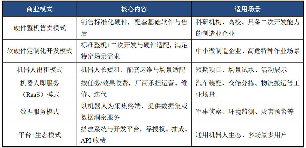 工业、服务、特种人形机器人主要包含硬件整机售卖、软硬件定制化开发、机器人出租、RaaS、数据服务、平台+生态六种商业模式,短期以硬件与定制化为主,中期向RaaS模式演进,长期将形成平台化、生态化发展格局。
