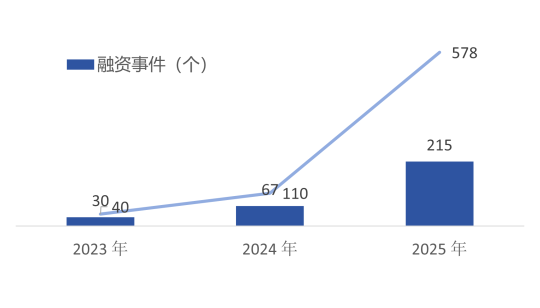 根据融中数据统计,2025年全球人形机器人领域融资规模出现明显跃迁,融资事件数量由67起提升至215起,增幅约221%,融资金额由110亿元增长至578亿元,增幅约425%。