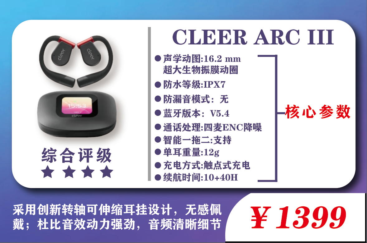 最后是佩戴表现,CLEER ARC III采用了0度”亲肤硅胶材质,摸着手感软乎乎的,单耳12克戴久了也不压耳朵;最方便的是创新转轴可伸缩耳挂,能跟着自己的耳型调,戴得稳还不勒,哪怕戴一下午,耳朵也没觉得累。