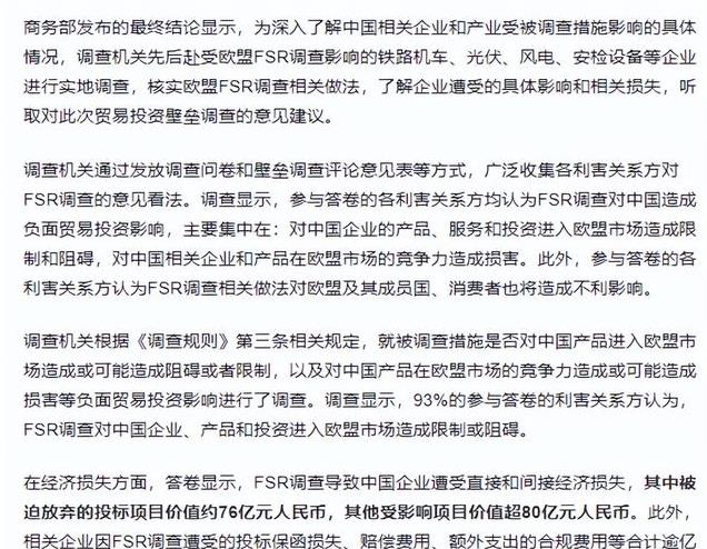 本来想要购买中企这些产品的企业,中国也是进行调查了,得到的结论是无论是外企还是中企都认为中国的贸易受到了欧盟FSR调查的负面影响。