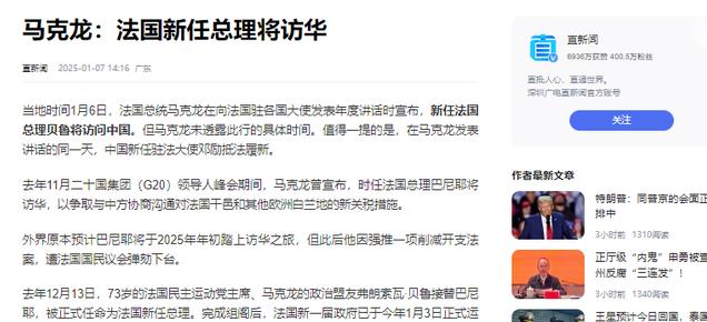 信息来源:参考新闻2025-1-7 马克龙:法国新总理将访华