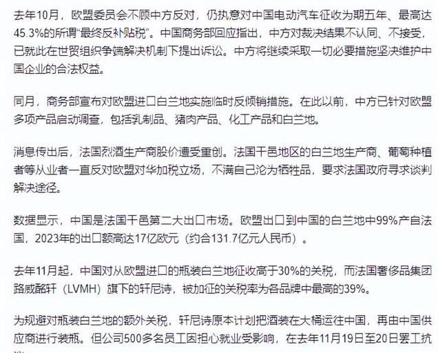 这也引起了大家的好奇,因为法国曾经在2024年的11月就已经宣布过将会访华,而访华的目的则是与中方协商,法国白邑以及欧洲白地兰等新关税的措施。