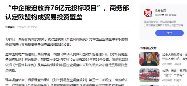 信息来源:观察者网2025-1-9 “中企被迫放弃76亿元投标项目”,商务部认定欧盟构成贸易投资壁垒