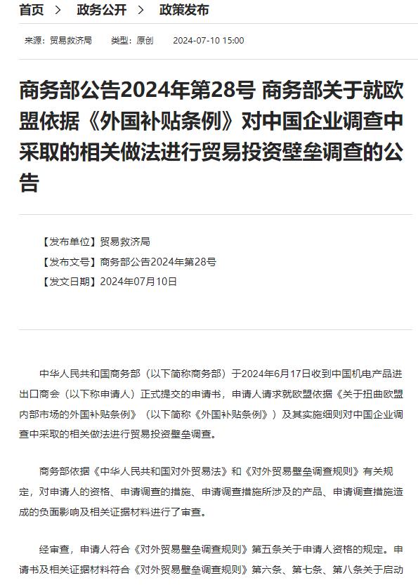 信息来源:贸易救济局2024-7-10 商务部公告2024年第28号 商务部关于就欧盟依据《外国补贴条例》对中国企业调查中采取的相关做法进行贸易投资壁垒调查的公告