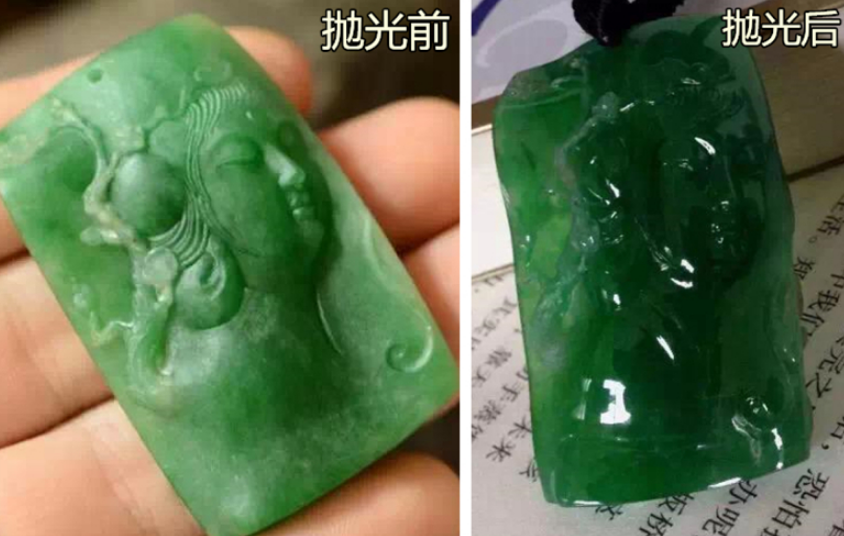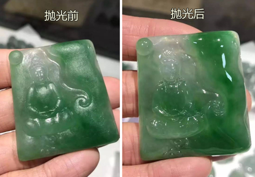 抛光、打磨完成后,翡翠的表面就变得光滑了,然后还要清洗,完成一系列的工序,翡翠的颜色就好像变得鲜艳了。