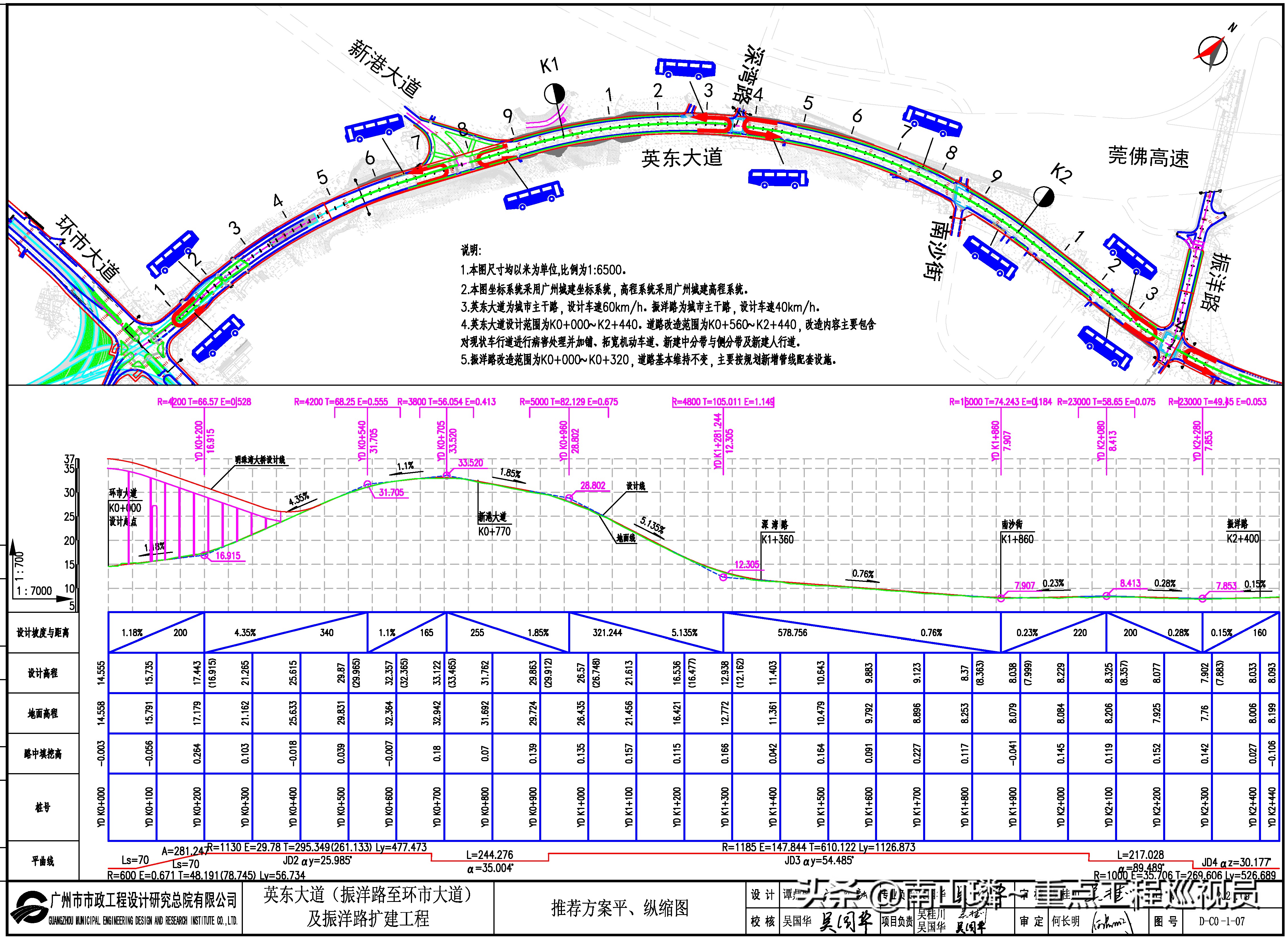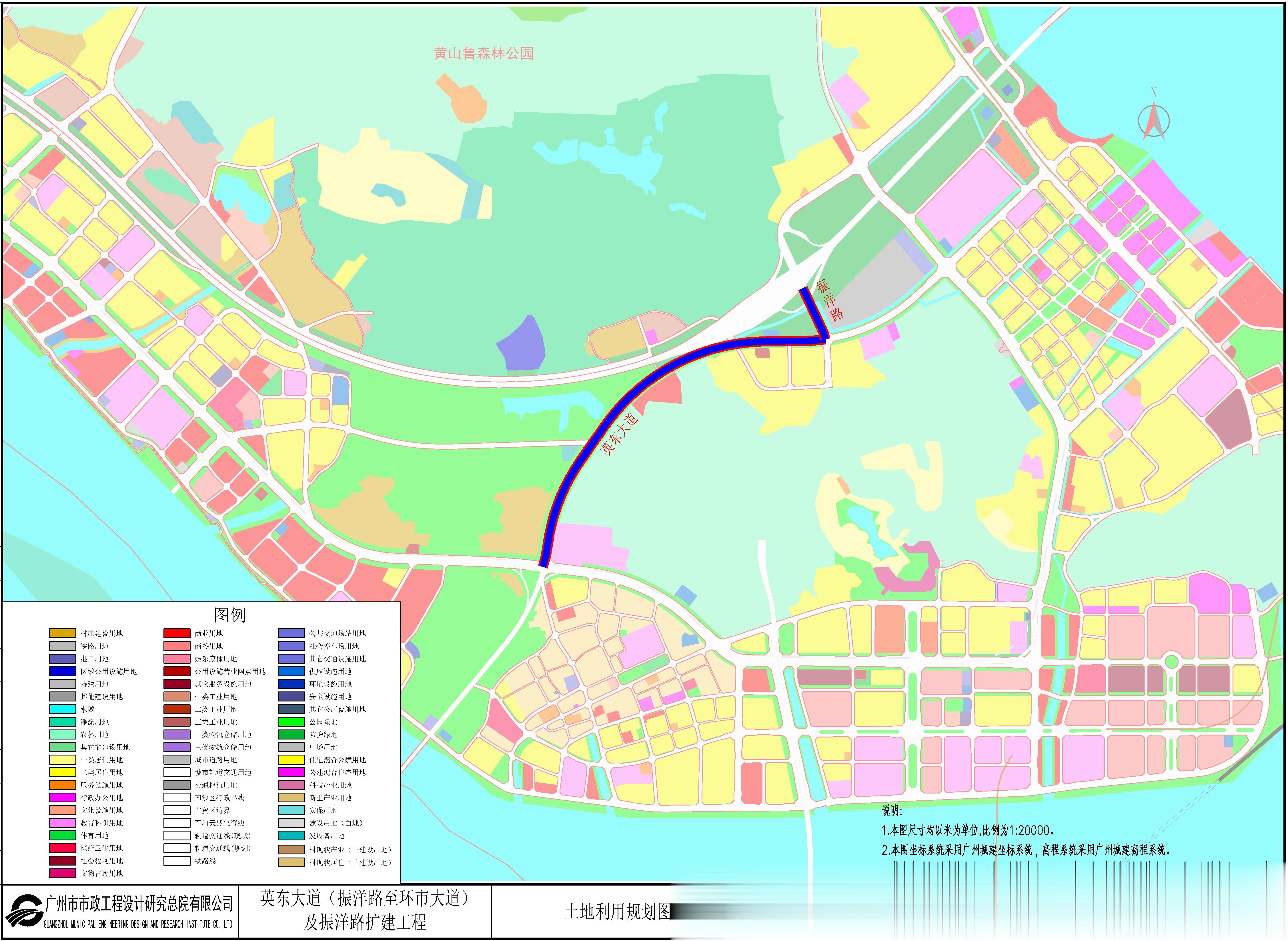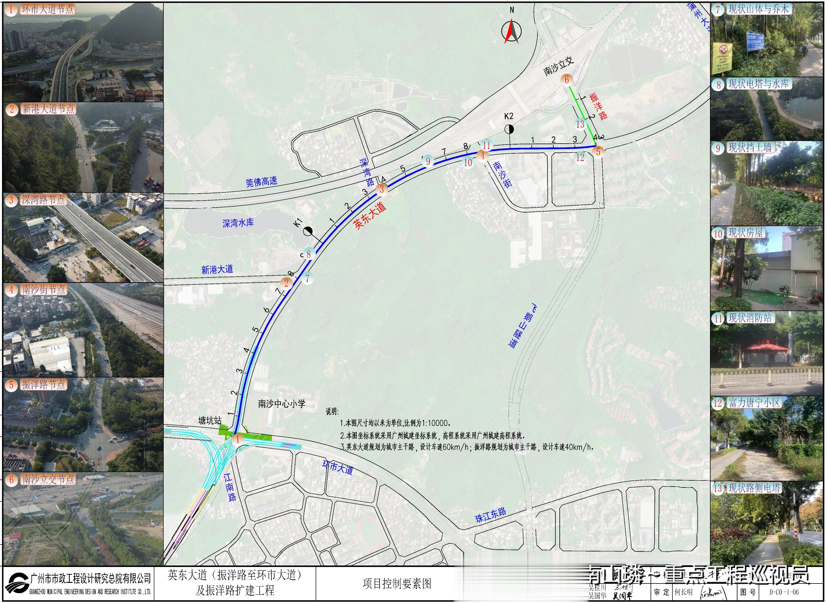 英东大道起于振洋路,止于环市大道,长约2400m,规划红线宽度为42m,城市主干路,设计速度60km/h;振洋路起于南沙立交,止于英东大道,长约320m,规划红线宽度50m,城市主干路,设计速度40km/h;道路总规模约2720m。