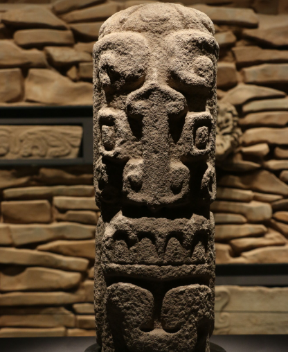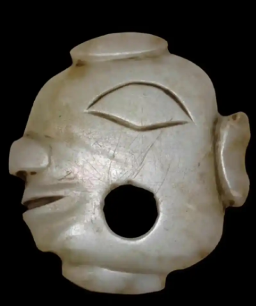 这些石雕神面的鼻子、耳饰、披发以及整体形貌与虞朝内服区的玉神像、玉人像都趋于一致。