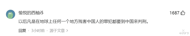 以后凡是在地球上任何一个地方残害中国人的罪犯都要到中国来判刑。
